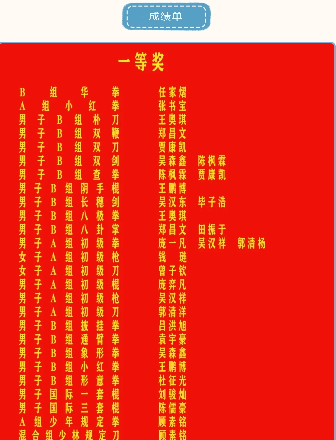 在本屆武術大賽中,鵝坡武校以鍛煉隊伍為目的,派出以三線隊員為主,二線隊員為輔的46名隊員參賽,以實戰檢驗訓練成果,為年輕隊員的成長注入強勁動能。鵝坡健兒以昂揚的斗志、精湛的技藝脫穎而出,共斬獲65枚金牌、12枚銀牌、8枚銅牌,團隊榮獲“體育道德風尚獎”。