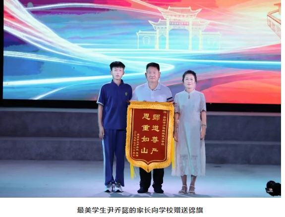 在溫馨的互動環節中,最美學生劉云賀手捧鮮花走向梁校長,深情鞠躬獻花,以此表達對校長諄諄教誨的感恩之情。更令人感動的是,最美學生尹喬懿的家長專程來到現場,向學校敬贈錦旗,以此感謝學校對孩子的悉心培養。暖心的互動環節將活動推向高潮,充分展現了學校師生間深厚的情誼。