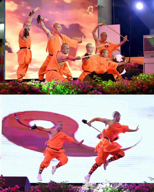 當(dāng)晚,在古晉南慶集市劇場(chǎng)舉行的國際友好城市之夜開幕式上,鵝坡武校表演團(tuán)作為首個(gè)出場(chǎng)團(tuán)隊(duì),以行云流水般的拳術(shù)、虎虎生風(fēng)的器械表演,將少林武術(shù)的精髓展現(xiàn)得淋漓盡致,贏得現(xiàn)場(chǎng)觀眾經(jīng)久不息的掌聲。