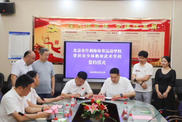 8月21日,北京市什剎海體育運動學校與登封市少林鵝坡武術學校合作簽約儀式在鵝坡武校隆重舉行。北京市什剎海體育運動學校校長周建東、副校長魯雪峰,與少林鵝坡武術學校校長梁少宗、副校長王金波等雙方領導共同出席了儀式。