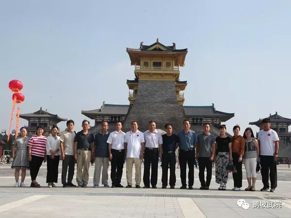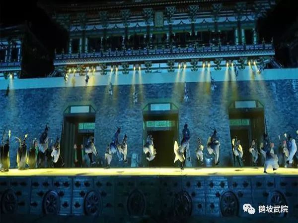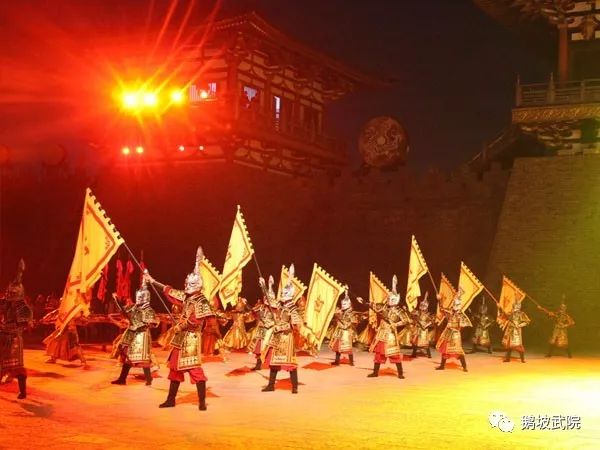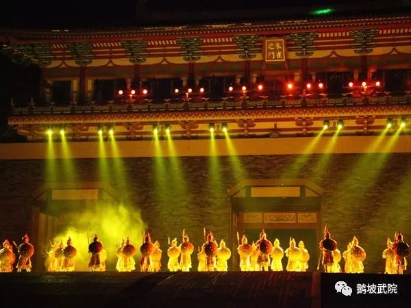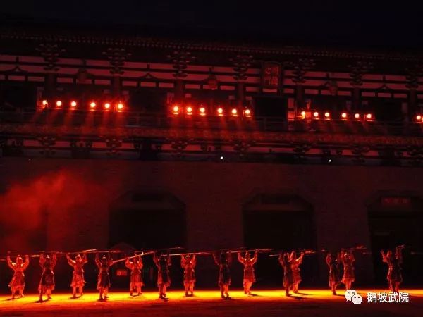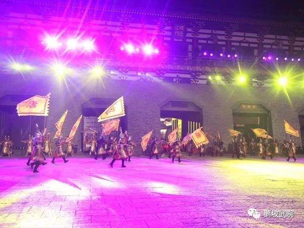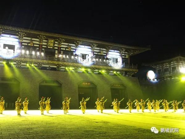 明德門、朱雀門演出是《大唐倚夢》前后壓軸戲,也是鵝坡弟子的重要表演地。7月14日夜晚正式演出時,鵝坡武院總教練梁少飛帶領鵝坡有關領導專程前往湖北襄陽,先后在明德門、朱雀門觀看助陣演出,并慰問師生。