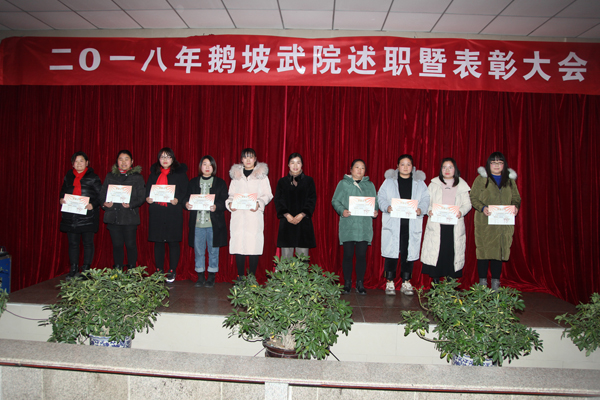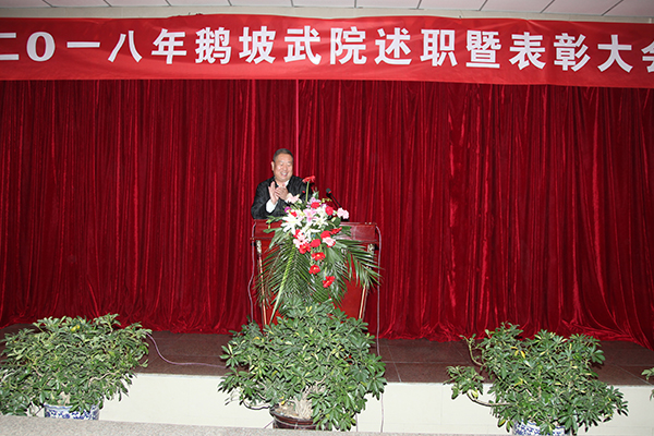 辛勤澆灌育桃李,鵝坡教育譜新篇。2018年12月22日,鵝坡武校隆重召開2018年述職暨教職工表彰大會。鵝坡武校創辦人梁以全宗師宗師,鵝坡武校總教練梁少飛,常務副校長常福曉,副校長周洪多、李澤飛,校長助理梁毛占、梁洪勛等領導和全院教職員工參加了會議。武教處、中專教務處、中小學文教處、總務處、全托處、餐飲處、辦公室等部門領導就2018學院文武教學、行政和后勤服務管理等方面的工作向全校教職員工述職匯報。