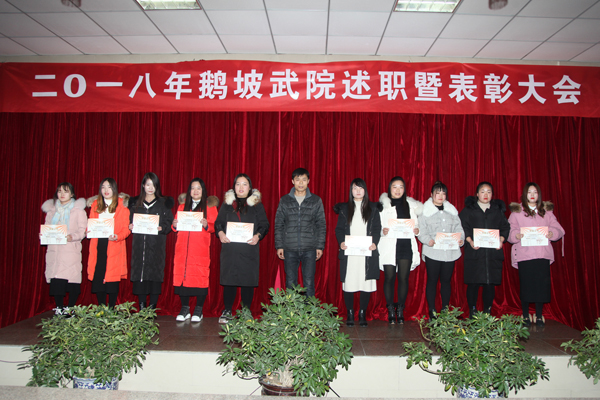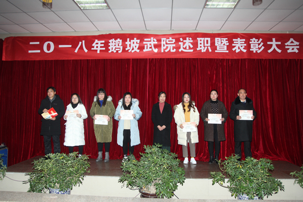 2018年,鵝坡武院全體教職員工胸懷全局,立足本職,開拓進取,甘于奉獻,為提升學院教育教學質量做出了積極的貢獻,涌現出了一大批愛崗敬業、成績顯著的優秀同志。會上,分別對特等先進工作者、先進工作者、安全穩定獎獲得者及文化教學先進班級進行了表彰獎勵。